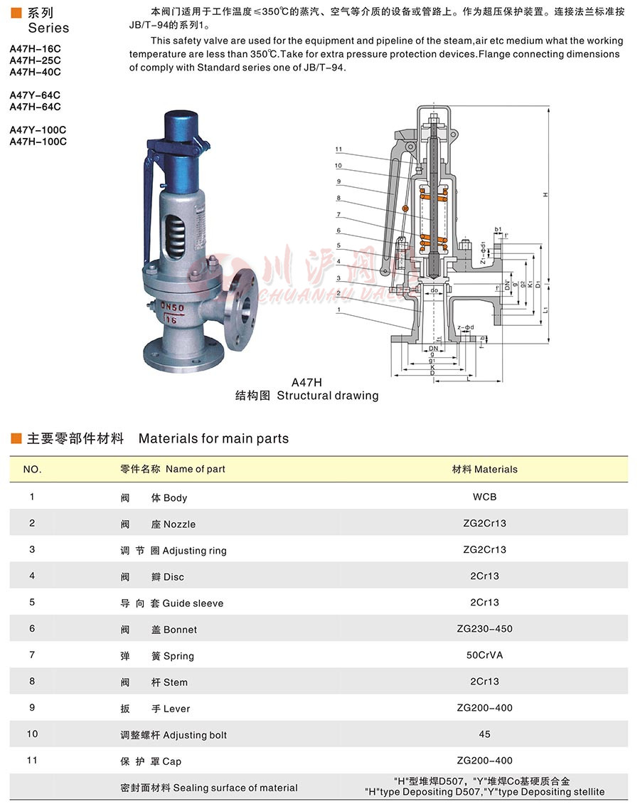 A47H彈簧微啟式安全閥適用于工作溫度≤350℃的蒸汽、空氣等介質(zhì)的設備或管路上。作為超壓保護裝置。連接法蘭標準按JB/T-94的系列1。