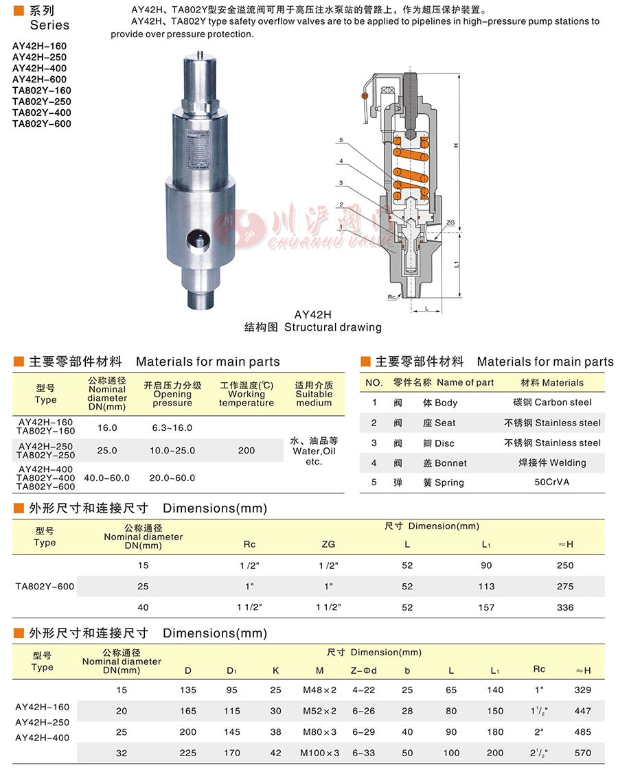 AY42H、TA802Y型安全溢流閥可用于高壓注水泵站的管路上,作為超壓保護裝置。