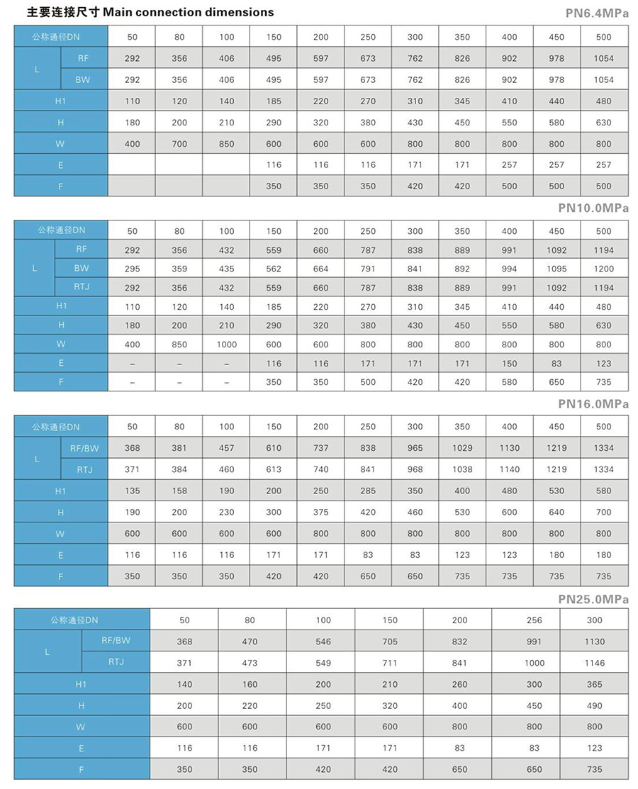 壓力范圍:國標(biāo)(PN1.6、4.0、6.4、10.0、16.0、20.0、25.0Mpa)、美標(biāo)(Class150、300、600)