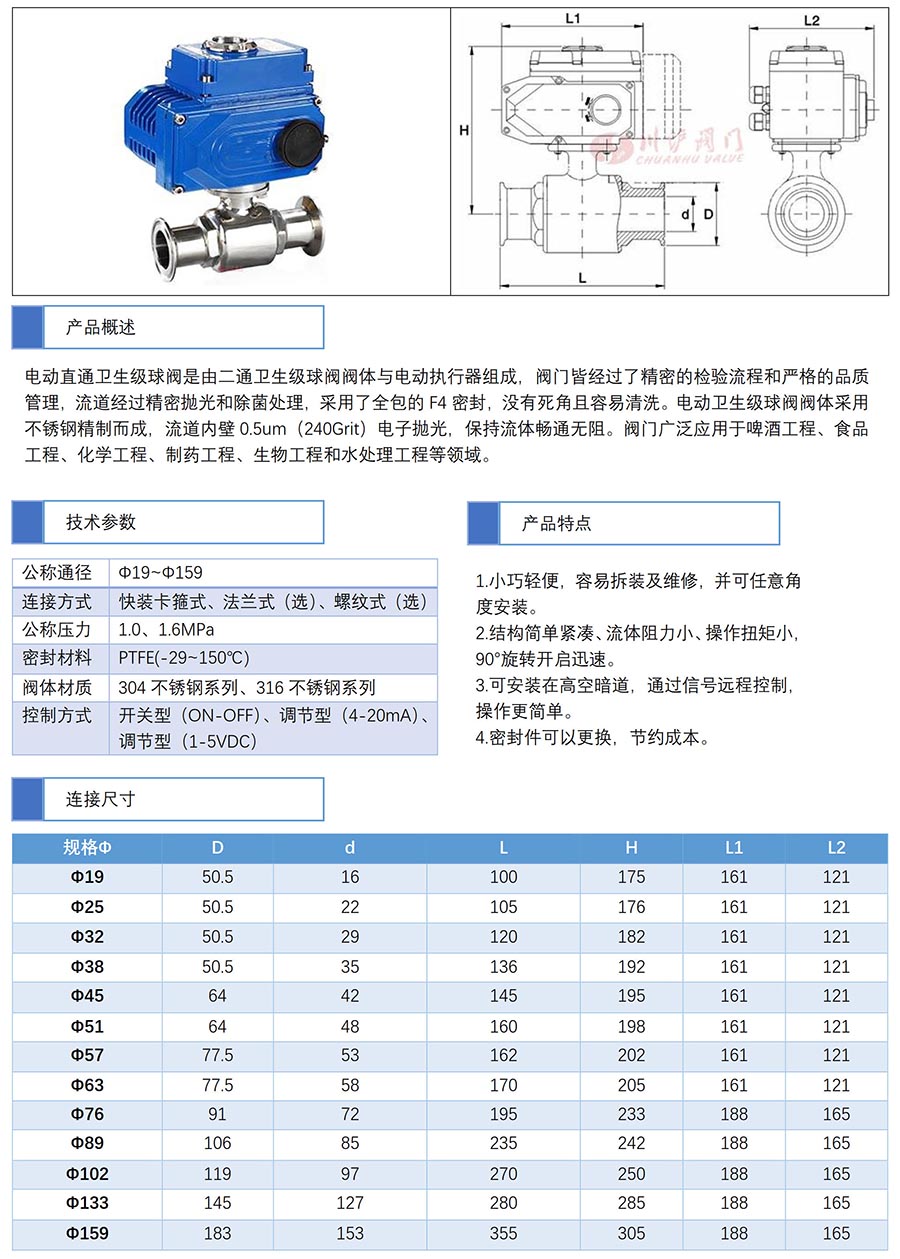 電動直通衛(wèi)生級球閥是由二通衛(wèi)生級球閥閥體與電動執(zhí)行器組成,閥門皆經(jīng)過了精密的檢驗流程和嚴格的品質(zhì)管理,流道經(jīng)過精密拋光和除菌處理,沒有死角且容易清洗。電動衛(wèi)生級球閥閥體采用不銹鋼精制而成,流道內(nèi)壁0.5um(240Grit)電子拋光,保持流體暢通無阻。閥門廣泛應(yīng)用于啤酒工程、食品工程、化學工程、制藥工程、生物工程和水處理工程等領(lǐng)域。