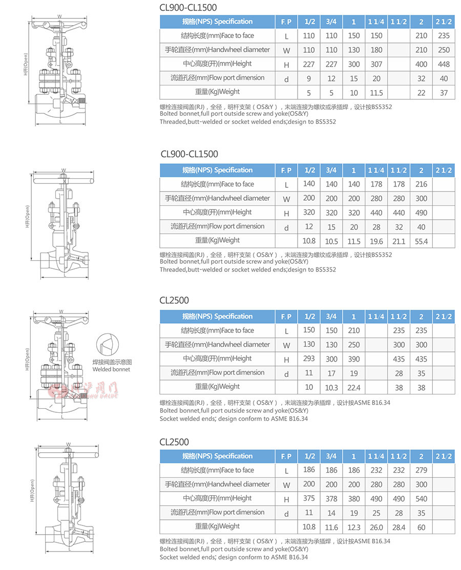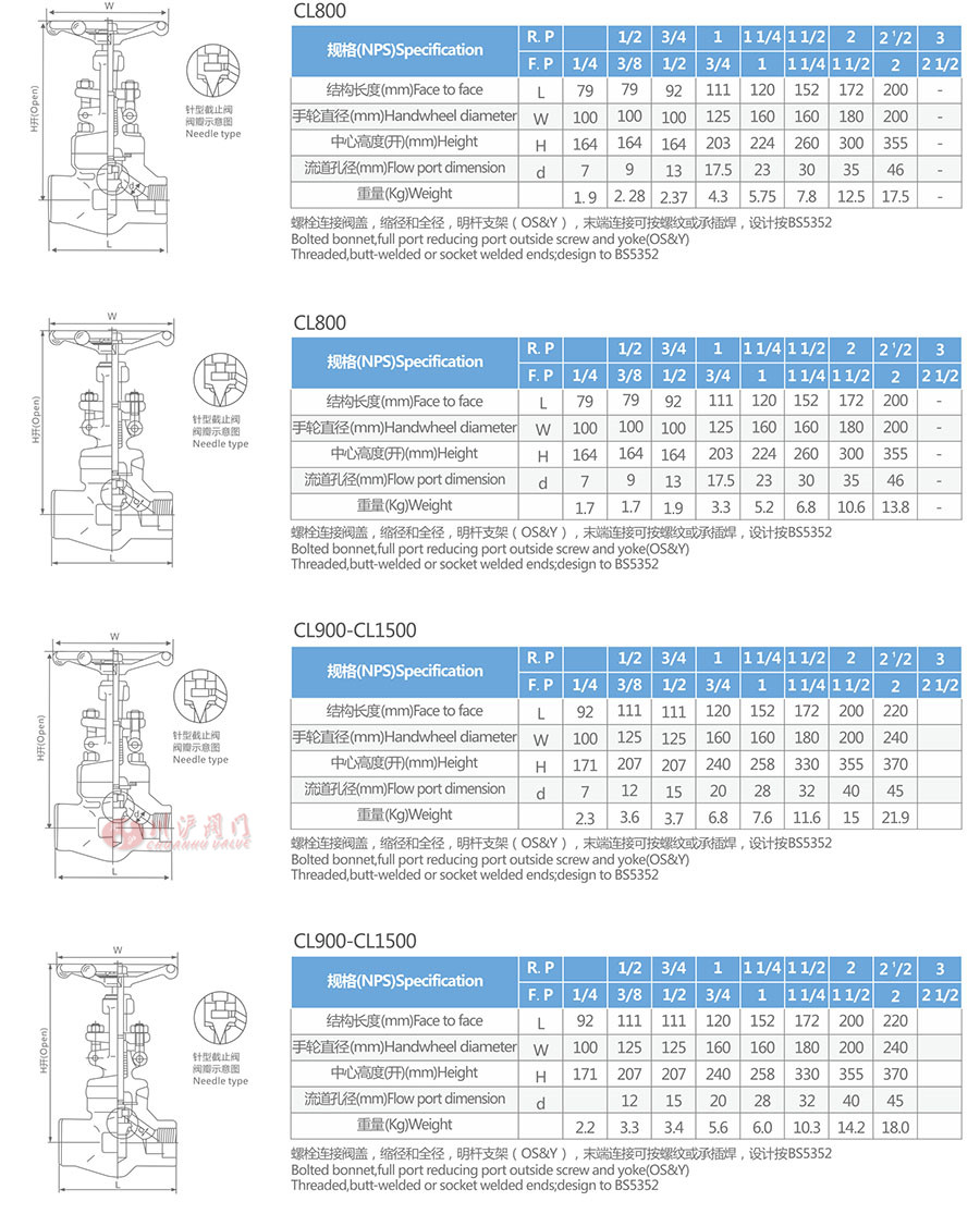內螺紋與承插焊截止閥參數 (Valve Parameters)
