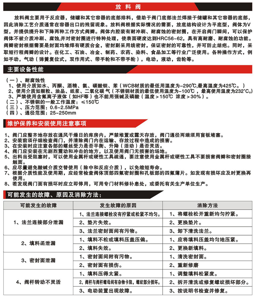 氣動放料閥帶手動主要用于反應(yīng)器,儲罐和其它容器的底部排料,借助于閥門底部法蘭焊接于儲罐和其它容器的底部,因此消除工藝介質(zhì)通常在容器出口的殘留現(xiàn)象。放料閥根據(jù)實際情況的需要,放底結(jié)構(gòu)設(shè)計為平底型,閥體為V型,并提供提升和下降兩種工作方式閥瓣。閥體內(nèi)腔裝有耐沖刷、耐腐蝕的密封圈,在開啟閥門瞬間,可以保護(hù)閥體不被介質(zhì)沖刷、腐蝕,并對密封圈進(jìn)行特種處理,使表面硬度達(dá)到HRC56~62,具有高耐磨、耐腐蝕的功能。