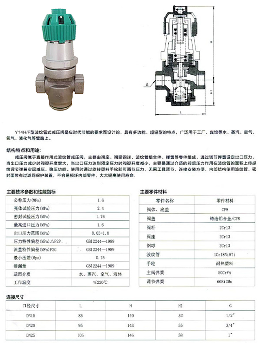 Y14H波紋管減壓閥是應(yīng)時代節(jié)能的要求而設(shè)計的,具有多功能、超輕型的特點,廣泛用于工廠、賓館等水、蒸汽、空氣、氧氣、液化氣等管路上。