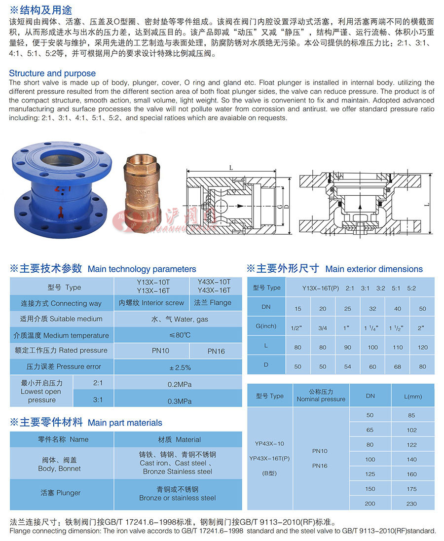 YB43X固定比例式減壓閥由閥體、活塞、壓蓋及O型圈、密封墊等零件組成。該閥在閥門內(nèi)腔設(shè)置浮動(dòng)式活塞,利用活塞兩端不同的橫截面積,從而形成進(jìn)水與出水的壓力差,達(dá)到減壓目的。該產(chǎn)品即減“動(dòng)壓”又減“靜壓”,結(jié)構(gòu)嚴(yán)謹(jǐn)、運(yùn)行流暢、體積小巧重量輕,便于安裝與維護(hù),采用先進(jìn)的工藝制造與表面處理,防腐防銹對(duì)水質(zhì)絕無污染。本公司提供的標(biāo)準(zhǔn)壓力比:2:1、3:1、 4:1、5:1、5:2等,并可根據(jù)用戶的要求設(shè)計(jì)特殊比例減壓閥。