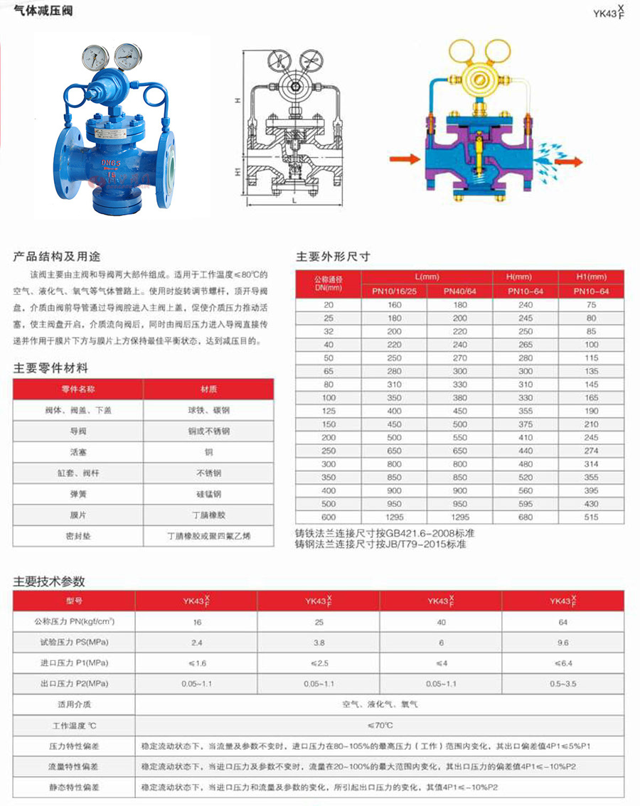 YK43X/F氣體減壓閥主要由主閥和導(dǎo)兩大部件組成。適用于工作溫度≤150℃的空氣、液化氣、氯氣等氣體管路上。使用時旋轉(zhuǎn)調(diào)節(jié)螺桿,項開導(dǎo)閥盤.介質(zhì)由閥前導(dǎo)管通過導(dǎo)閥腔進入主閥上蓋,促使介質(zhì)壓力推動活富,使主閥盤開啟,介質(zhì)流向閥后,同時由閥后壓力進入導(dǎo)閥直接傳遞并作用于膜片下方與膜片上方保持好平衡狀態(tài),達到減壓目的。
