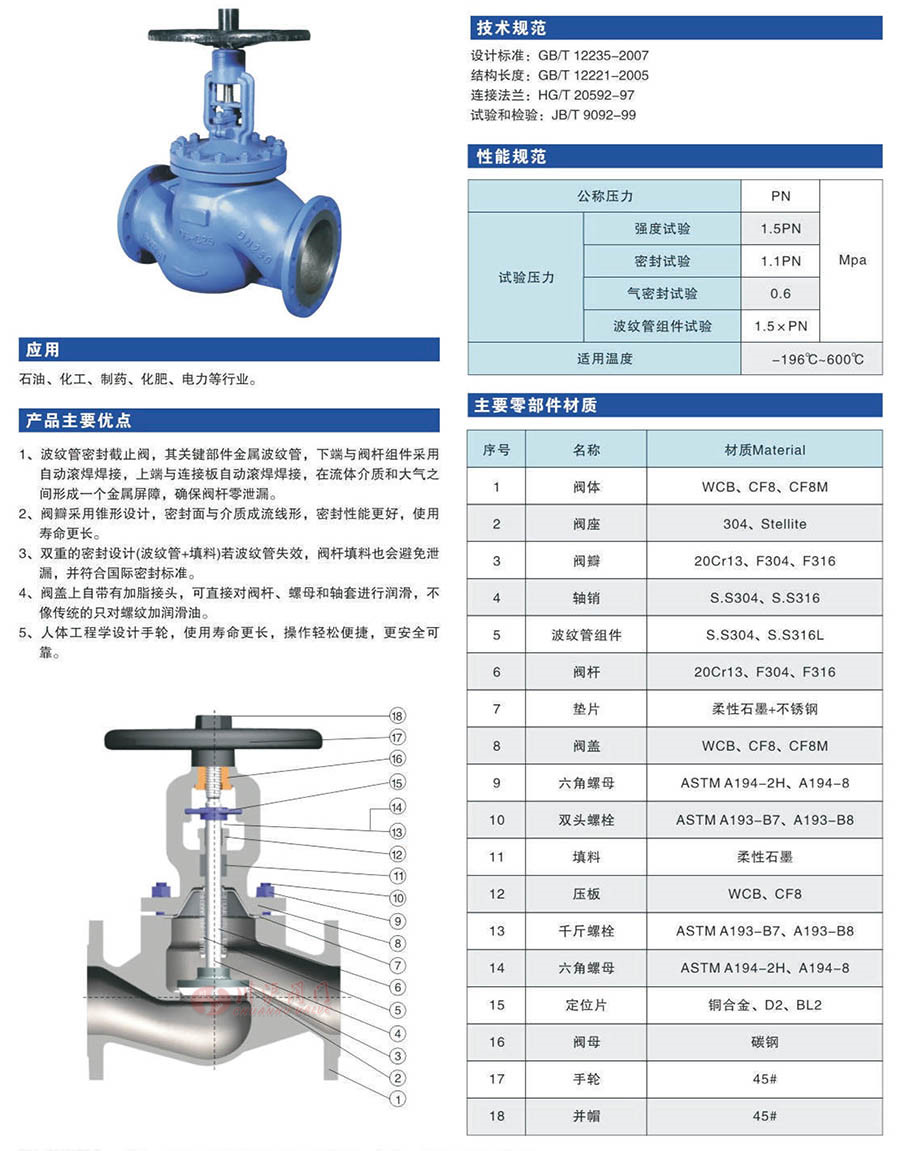 1、波紋管密封截止閥,其關(guān)鍵部件金屬波紋管,下端與閥桿組件采用自動滾焊焊接,上端與連接板自動滾焊焊接,在流體介質(zhì)和大氣之間形成一個金屬屏障,確保閥桿零泄漏。