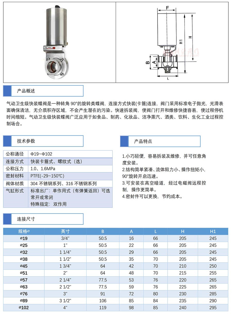 整體不銹鋼衛(wèi)生級蝶閥是一種轉(zhuǎn)角90°的旋轉(zhuǎn)類蝶閥,連接方式快裝(卡箍)連接,閥門采用標(biāo)準(zhǔn)電子拋光,光滑表面確保清潔,無介質(zhì)積存區(qū)域,不會產(chǎn)生潛在的污染??焖俨鹧b閥,使閥門打開和維修快捷容易,使過程停機時間縮短。整體不銹鋼衛(wèi)生級蝶閥廣泛應(yīng)用于如食品、制藥、化妝品、潔凈蒸汽、酒類、飲料、生化工業(yè)過程控制場合。