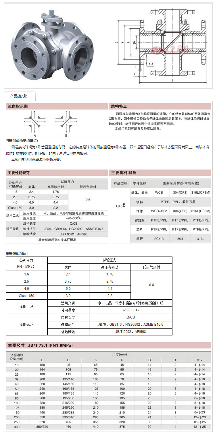 氣動(dòng)四通球閥是由四通球閥和氣動(dòng)執(zhí)行器組成,四通換向球閥為X形垂直通道的球閥,它的特點(diǎn)是球體的兩條通道為X形布置,四個(gè)通道口徑均布于球體赤道圓周截面上,當(dāng)球體沿順時(shí)針旋轉(zhuǎn)90度時(shí),能使相近的兩個(gè)通道實(shí)現(xiàn)兩兩相通。