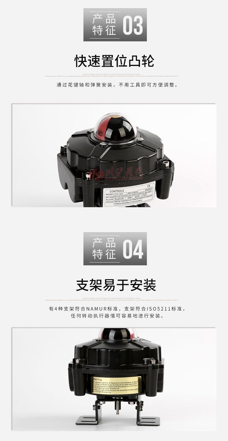 防爆型限位開關(guān)是作用于氣缸上的一種反饋附件,內(nèi)部8個觸點接線板符合微型開關(guān)的標(biāo)準(zhǔn),DPDT開關(guān)可選、接近開關(guān)、磁性開關(guān)可選并可用于電磁閥的連接。防爆型限位開關(guān)采用壓鑄鋁合金殼體,粉末涂層,緊湊設(shè)計外型美觀,減少閥門包裝體積,質(zhì)量可靠。