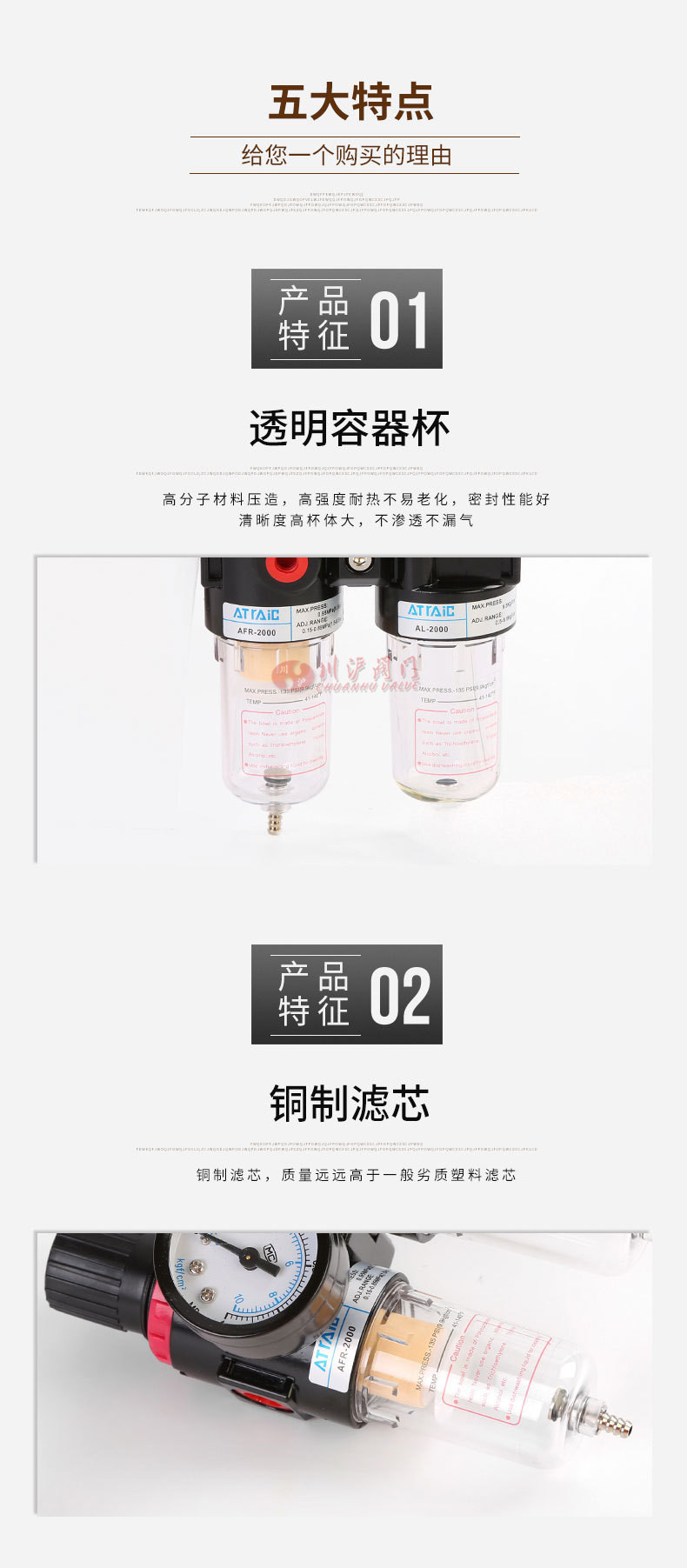 氣源三聯(lián)件高分子材料壓造,高強(qiáng)度耐熱不易老化,密封性能好清晰度高杯體大,不滲透不漏氣。采用標(biāo)準(zhǔn)化模塊設(shè)計(jì),可任意分解組合,滿足不同氣動(dòng)系統(tǒng)需求。