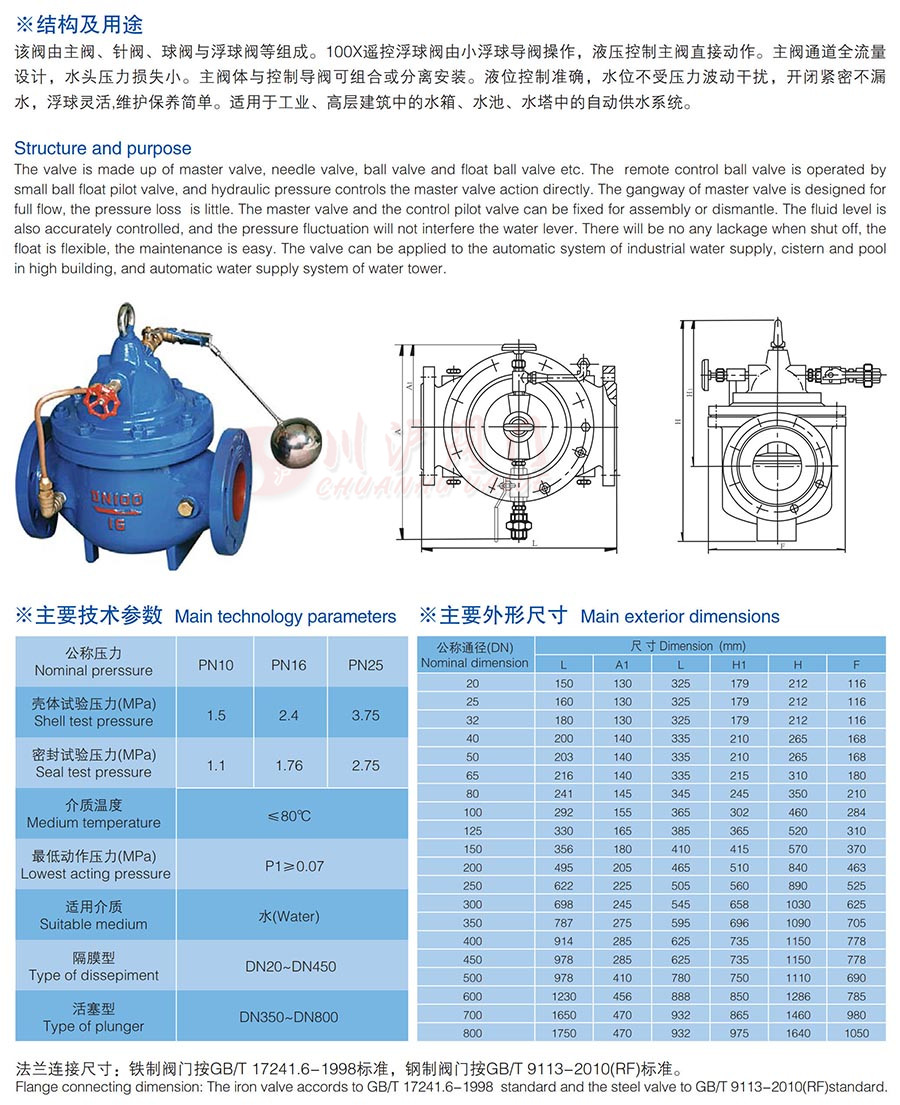 100X遙控浮球閥由主閥、針閥、球閥與浮球閥等組成。100X遙控浮球閥由小浮球?qū)чy操作,液壓控制主閥直接動作。主閥通道全流量設計,水頭壓力損失小。主閥體與控制導閥可組合或分離安裝。液位控制準確,水位不受壓力波動干擾,開閉緊密不漏水,浮球靈活,維護保養(yǎng)簡單。適用于工業(yè)、高層建筑中的水箱、水池、水塔中的自動供水系統(tǒng)。