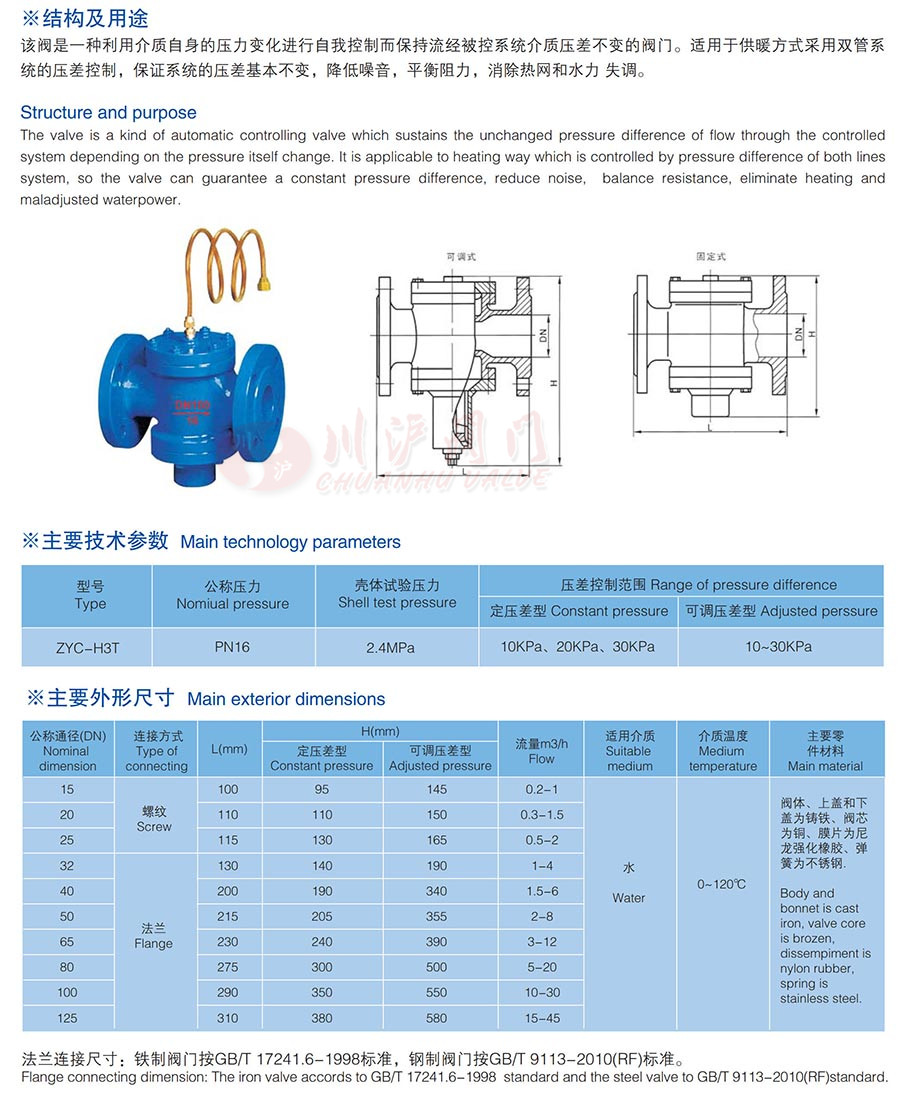 ZYC自力式壓差控制閥是一種利用介質(zhì)自身的壓力變化進(jìn)行自我控制而保持流經(jīng)被控系統(tǒng)介質(zhì)壓差不變的閥門。適用于供暖方式采用雙管系統(tǒng)的壓差控制,保證系統(tǒng)的壓差基本不變,降低噪音,平衡阻力,消除熱網(wǎng)和水力失調(diào)。