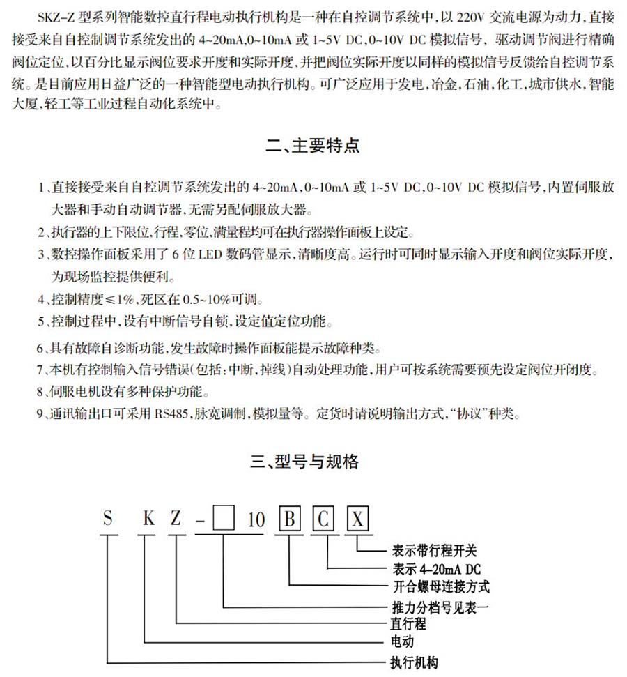 SKZ-Z型系列智能數(shù)控直行程電動(dòng)執(zhí)行機(jī)構(gòu)是一種在自控調(diào)節(jié)系統(tǒng)中,220V交流電源為動(dòng)力,直接接受來自自控制調(diào)節(jié)系統(tǒng)發(fā)出的4~20mA,0-10mA或1~5VDC,0~10VDC模擬信號(hào),驅(qū)動(dòng)調(diào)節(jié)閥進(jìn)行精確閥位定位,分比顯示閥位要求開度和實(shí)際開度,并把閥位實(shí)際開度以同樣的模擬信號(hào)反饋給自控調(diào)節(jié)系統(tǒng)。是目前應(yīng)用日益廣泛的一種智能型電動(dòng)執(zhí)行機(jī)構(gòu)??蓮V泛應(yīng)翩于發(fā)電,冶金,石油,化工,城市供水,智能大廈,輕工等工業(yè)過程自動(dòng)化系統(tǒng)中。