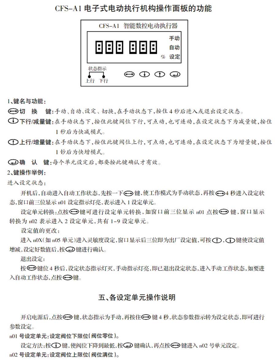 2、執(zhí)行器的上下限位,行程零位,滿量程均可在執(zhí)行器操作面板上設(shè)定。