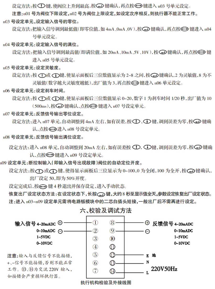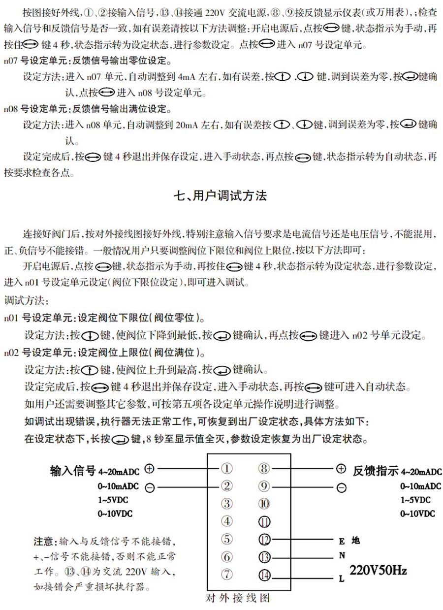 7、本機(jī)有控制輸入信號(hào)錯(cuò)誤(包括:中斷,掉線)自動(dòng)處理功能,用戶可按系統(tǒng)需要預(yù)先設(shè)定閥位開閉度。