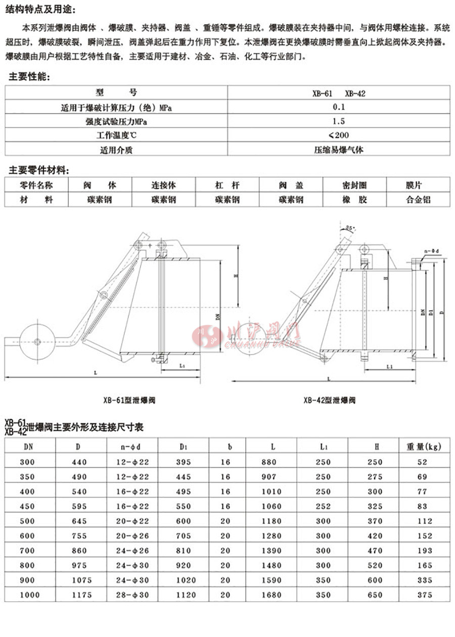 XB42/XB61泄爆閥由閥體、爆破膜、夾持器、閥蓋、重錘等零件組成。爆破膜裝在夾持器中間,與閥體用螺栓連接。系統(tǒng)超壓時,爆破膜破裂,瞬間泄壓,閥蓋彈起后在重力作用下復(fù)位。本泄爆閥在更換爆破膜時需垂直向上掀起閥體及夾持器。