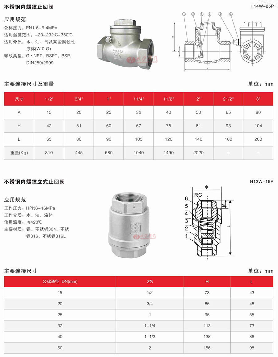 H14W/H12W內(nèi)螺紋止回閥應(yīng)用范圍: